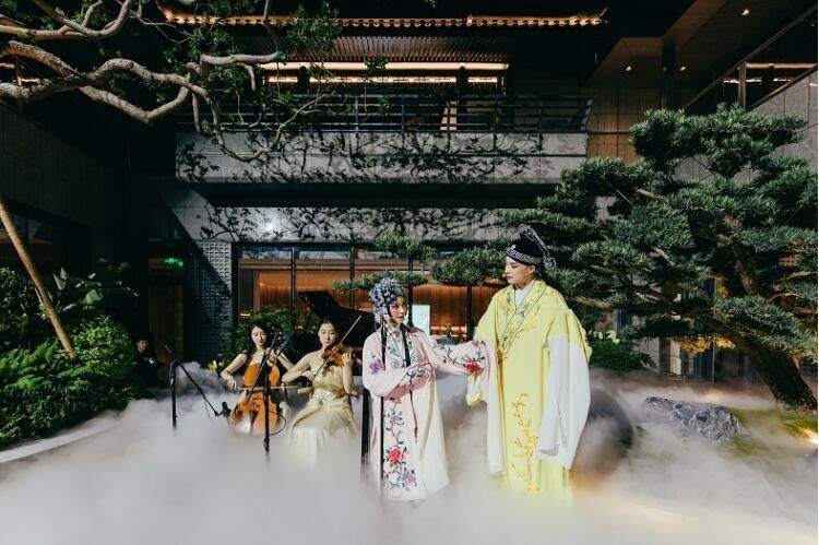 别开生面的沉浸式游园,让到场嘉宾们叹为观止。新颖的黑白对弈签到形式,别具一格令人眼前一亮;激动人心的剪彩瞬间,迎候会所落成的华美时刻。华丽典雅的会所内堂,八大主题私享空间有序分布,观赏精致灵动的茶艺表演,品鉴热情四溢的花式调酒,时不时与扮相纷呈的古装人物邂逅偶遇,仿若穿梭于时间长河,收获惊喜无数;嘉宾们齐聚下沉式庭院,当国粹昆曲剧目《牡丹亭》圆润柔美的唱腔声起,沉浸于“游园”、“寻梦”悠扬徐缓的音韵中,回味无穷;聆听现代弦乐演绎的圆舞曲、探戈等经典曲目,顿感荡气回肠的气韵扑面而来。当古风国粹与现代弦乐美好相逢,可谓融汇古今集萃一园。一场移步异景的游园之旅,一席酣畅淋淋的视听享宴,欢享佳境已成的荣耀时刻。